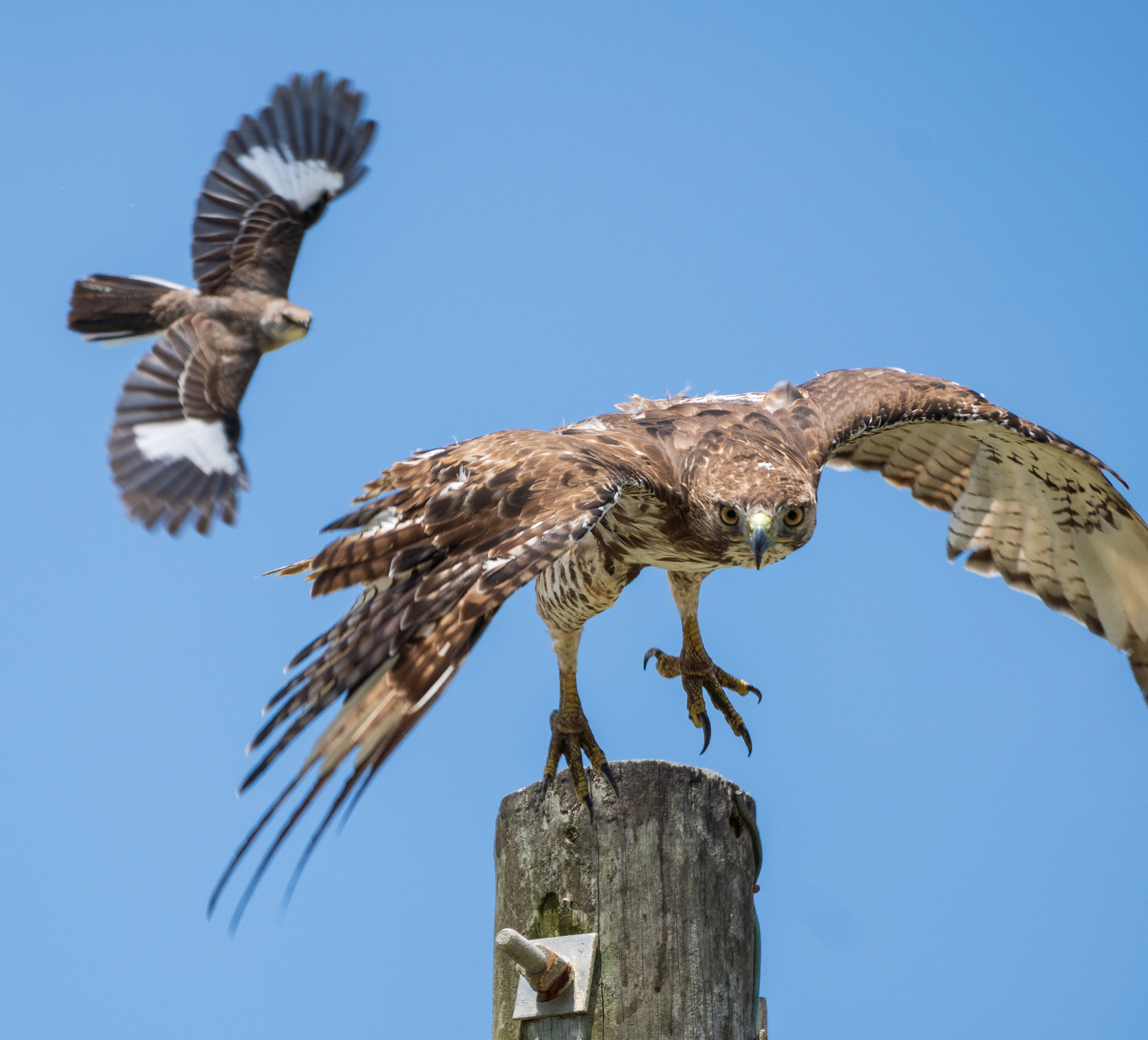 Mockingbird Mobbing a Red-tailed Hawk - 2